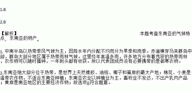 1.B 2.B 【解析】本题考查东南亚的气候特点、东南亚的物产。 1. 中南半岛以热带季风气候为主,因降水年内分配不均而分为旱季和雨季。赤道横穿马来群岛中部,群岛大部分地区属于热带雨林气候。这里终年高温多雨,许多地方分布着茂密的热带雨林,农作物可以随时播种,一年到头都有收获。所以代表团成员没有必要携带的是御寒衣物。 2.东南亚绝大部分位于热带,是世界上天然橡胶、油棕、椰子和...