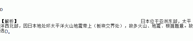 D 【解析】日本位于亚洲东部,太平洋西北部,因日本地处环太平洋火山地震带上(板块交界处),故多火山、地震.根据题意。故选D。