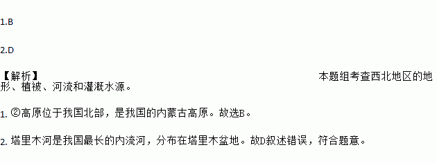 1.B 2.D 【解析】本题组考查西北地区的地形、植被、河流和灌溉水源。 1. ②高原位于我国北部,是我国的内蒙古高原。故选B。 2. 塔里木河是我国最长的内流河,分布在塔里木盆地。故D叙述错误,符合题意。