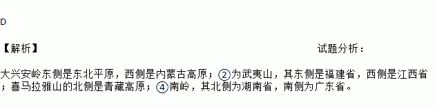 D 【解析】试题分析: 大兴安岭东侧是东北平原,西侧是内蒙古高原;②为武夷山,其东侧是福建省,西侧是江西省;喜马拉雅山的北侧是青藏高原;④南岭,其北侧为湖南省,南侧为广东省。