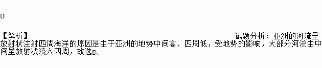 D 【解析】试题分析:亚洲的河流呈放射状注射四周海洋的原因是由于亚洲的地势中间高、四周低,受地势的影响,大部分河流由中间呈放射状流入四周,故选D.