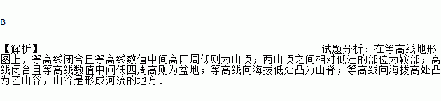B 【解析】试题分析:在等高线地形图上,等高线闭合且等高线数值中间高四周低则为山顶;两山顶之间相对低洼的部位为鞍部;高线闭合且等高线数值中间低四周高则为盆地;等高线向海拔低处凸为山脊;等高线向海拔高处凸为乙山谷,山谷是形成河流的地方。