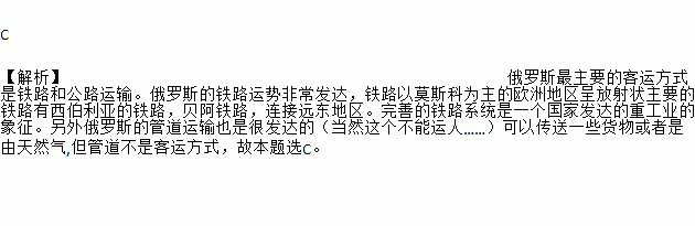 C 【解析】俄罗斯最主要的客运方式是铁路和公路运输。俄罗斯的铁路运势非常发达,铁路以莫斯科为主的欧洲地区呈放射状主要的铁路有西伯利亚的铁路,贝阿铁路,连接远东地区。完善的铁路系统是一个国家发达的重工业的象征。另外俄罗斯的管道运输也是很发达的(当然这个不能运人……)可以传送一些货物或者是由天然气,但管道不是客运方式,故本题选C。