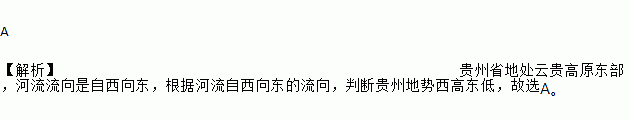 A 【解析】贵州省地处云贵高原东部,河流流向是自西向东,根据河流自西向东的流向,判断贵州地势西高东低,故选A。
