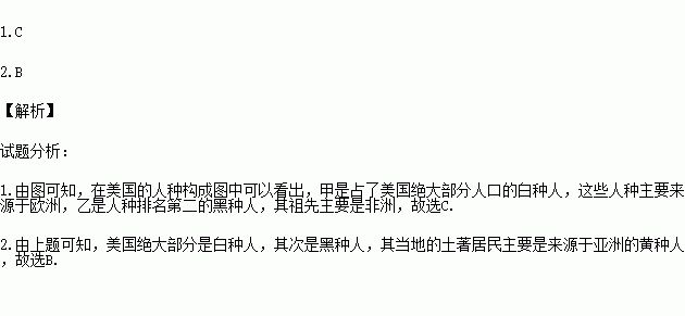 美国是一个多种族的移民国家,人口构成中,白人最多,黑人其次。印第安人是美国的土著居民。读图,回答下列问题。