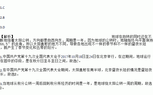 1.C 2.B 3.D 【解析】地球在自转的同时还在不断地绕着太阳公转,方向都是自西向东,周期是一年,因为地球的公转时,地轴始终与平面保持66.5°的夹角,所以太阳直射的地方不同,导致各地出现不一样的季节和不一样的昼夜长短,就产生了季节变化和五带的划分。 1.中国共产党第十九次全国代表大会于2017年10月18日至24日在北京举行,在这期间,地球运行在图中的③段,是在秋分日...