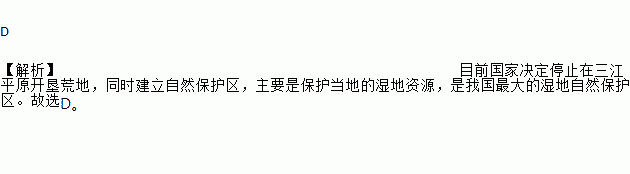D 【解析】目前国家决定停止在三江平原开垦荒地,同时建立自然保护区,主要是保护当地的湿地资源,是我国最大的湿地自然保护区。故选D。