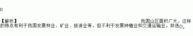 D 【解析】我国山区面积广大,这样的特点有利于我国发展林业、矿业、旅游业等,但不利于发展种植业和交通运输业,故选D。