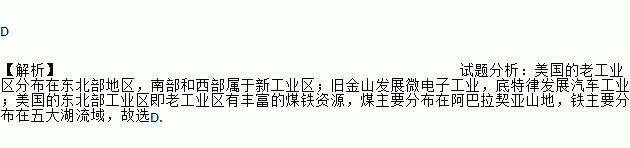 D 【解析】试题分析:美国的老工业区分布在东北部地区,南部和西部属于新工业区;旧金山发展微电子工业,底特律发展汽车工业;美国的东北部工业区即老工业区有丰富的煤铁资源,煤主要分布在阿巴拉契亚山地,铁主要分布在五大湖流域,故选D.