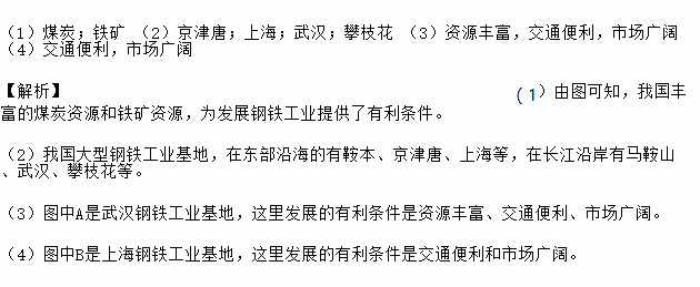 (1)煤炭;铁矿 (2)京津唐;上海;武汉;攀枝花 (3)资源丰富,交通便利,市场广阔 (4)交通便利,市场广阔 【解析】(1)由图可知,我国丰富的煤炭资源和铁矿资源,为发展钢铁工业提供了有利条件。 (2)我国大型钢铁工业基地,在东部沿海的有鞍本、京津唐、上海等,在长江沿岸有马鞍山、武汉、攀枝花等。 (3)图中A是武汉钢铁工业基地,这里发展的有利条件是资源丰富、交通便利、市场广阔...