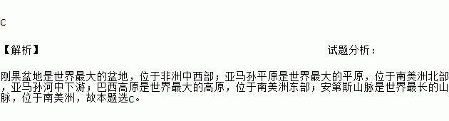 C ¡¾½âÎö¡¿ÊÔÌâ·ÖÎö£º ¸Õ¹ûÅèµØÊÇÊÀ½ç×î´óµÄÅèµØ£¬Î»ÓÚ·ÇÖÞÖÐÎ÷²¿£»ÑÇÂíËïÆ½ÔÊÇÊÀ½ç×î´óµÄƽԣ¬Î»ÓÚÄÏÃÀÖÞ±±²¿£¬ÑÇÂíËïºÓÖÐÏÂÓΣ»°ÍÎ÷¸ßÔÊÇÊÀ½ç×î´óµÄ¸ßÔ£¬Î»ÓÚÄÏÃÀÖÞ¶«²¿£»°²µÚ˹ɽÂöÊÇÊÀ½ç×µÄɽÂö£¬Î»ÓÚÄÏÃÀÖÞ£¬¹Ê±¾ÌâÑ¡C¡£