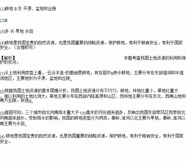 (1)从土地利用类型上看,“五谷丰登”的基础是___________,其在图中用___________(填字母)表示,主要分布在___________(东、西)部___________(地形类型)。