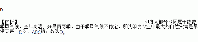 D 【解析】印度大部分地区属于热带季风气候,全年高温,分旱雨两季,由于季风气候不稳定,所以印度农业中最大的自然灾害是旱涝灾害,D对,ABC错。故选D。