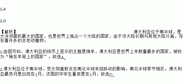 1.A 2.D 【解析】澳大利亚位于南半球,是大洋洲面积最大的国家,也是世界上独占一个大陆的国家,由于该大陆长期与其他大陆分离,存在着许多的古老动植物。 1.由图可知,澳大利亚的钱币上显示的主题是绵羊,澳大利亚是世界上羊数量最多的国家,被称为“骑在羊背上的国家”,故选A。 2.澳大利亚位于南半球,受太阳直射点在南北半球来回移动的影响,南北半球季节相反,澳大利亚最热月是出现在...