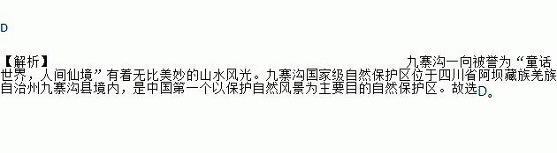 D 【解析】九寨沟一向被誉为“童话世界,人间仙境”有着无比美妙的山水风光。九寨沟国家级自然保护区位于四川省阿坝藏族羌族自治州九寨沟县境内,是中国第一个以保护自然风景为主要目的自然保护区。故选D。