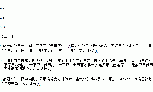 1.B 2.B 3.D 【解析】 1.位于两洲两洋之间十字路口的是东南亚,A错,亚洲并不是个马六甲海峡与大洋洲相望,亚洲和大西洋不相邻,亚洲地跨东、西、南、北四个半球,故选B。 2.亚洲地势中部高,四周低;地形以高原山地为主;世界上最大的平原是亚马孙平原,西西伯利亚平原是亚洲第一大平原,世界第三大平原;世界面积最大的高原是巴西高原;青藏高原是世界上海拔最高的高原,故本...