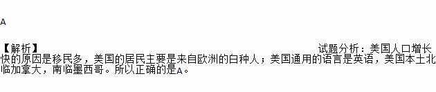 A 【解析】试题分析:美国人口增长快的原因是移民多,美国的居民主要是来自欧洲的白种人;美国通用的语言是英语,美国本土北临加拿大,南临墨西哥。所以正确的是A。