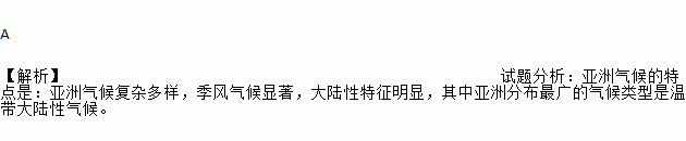 A 【解析】试题分析:亚洲气候的特点是:亚洲气候复杂多样,季风气候显著,大陆性特征明显,其中亚洲分布最广的气候类型是温带大陆性气候。