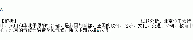 A 【解析】试题分析:北京位于太行山、燕山和华北平原的结合部,是我国的首都,全国的政治、经济、文化、交通、科研、教育中心。北京的气候为温带季风气候。所以本题选择A选项。