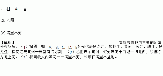 ????????????????? (2)乙图? (3)塔里木河 【解析】本题考查我国主要的河流分布状况。(1)据图可知,A、B、C、D、E分别代表黑龙江、松花江、黄河、长江、珠江,黑龙江、松花江与黄河一样都有结冰期。(2)乙图表示黄河下游河床高于当地平均地面,故被称为地上河。(3)我国最大内流河——塔里木河,分布在塔里木盆地。