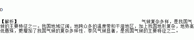 D 【解析】气候复杂多样,是我国气候的主要特征之一。我国地域辽阔,地跨众多的温度带和干湿地区,加上我国地形复杂,地势高低悬殊,更增加了我国气候的复杂多样性.季风气候显著,是我国气候的主要特征之二。