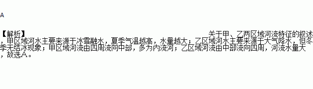 A. 甲区域河水主要来源于冰雪融水,夏季气温越高,水量越大
