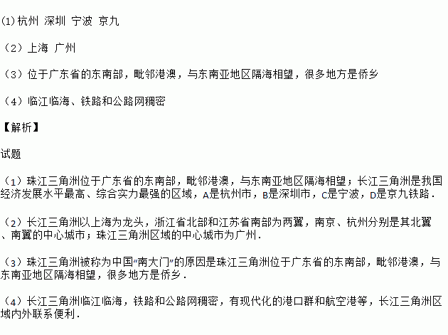 (2)长江三角洲区域的核心城市为_______,珠江三角洲区域的中心城市是_______。
