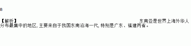 B 【解析】东南亚是世界上海外华人分布最集中的地区,主要来自于我国东南沿海一代,特别是广东、福建两省。