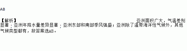 AB 【解析】亚洲面积广大,气温差别显著;亚洲年降水量差异显著;亚洲东部和南部季风强盛;亚洲除了温带海洋性气候外,其他气候类型都有,故答案选AB。