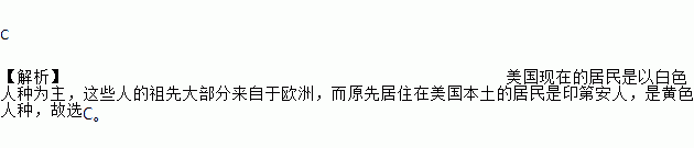 C 【解析】美国现在的居民是以白色人种为主,这些人的祖先大部分来自于欧洲,而原先居住在美国本土的居民是印第安人,是黄色人种,故选C。