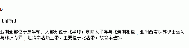 C. 亚洲西北以苏伊士运河与非洲为界 D. 地跨寒温热三带,主要位于北温带