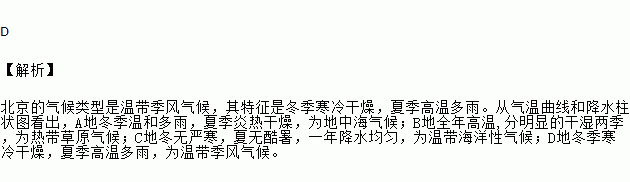 首都北京在北温带,四季分明,夏季高温多雨,下图中符合北京气候特征的是( )