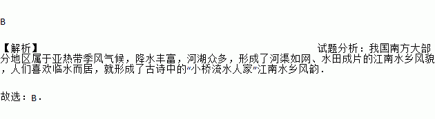 B 【解析】试题分析:我国南方大部分地区属于亚热带季风气候,降水丰富,河湖众多,形成了河渠如网、水田成片的江南水乡风貌,人们喜欢临水而居,就形成了古诗中的“小桥流水人家”江南水乡风韵. 故选:B.