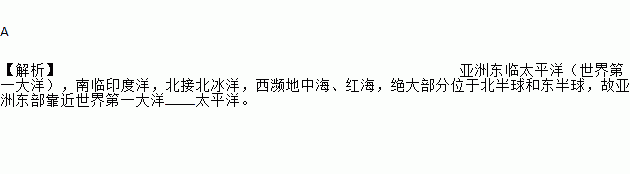 A 【解析】亚洲东临太平洋(世界第一大洋),南临印度洋,北接北冰洋,西濒地中海、红海,绝大部分位于北半球和东半球,故亚洲东部靠近世界第一大洋——太平洋。