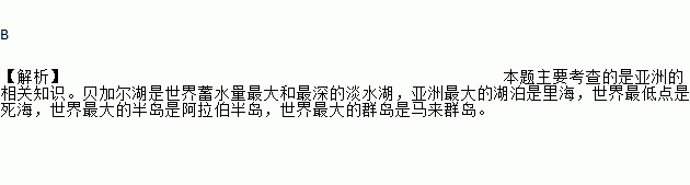 B 【解析】本题主要考查的是亚洲的相关知识。贝加尔湖是世界蓄水量最大和最深的淡水湖,亚洲最大的湖泊是里海,世界最低点是死海,世界最大的半岛是阿拉伯半岛,世界最大的群岛是马来群岛。
