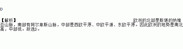 D 【解析】欧洲的北部是斯堪的纳维亚山脉,南部有阿尔卑斯山脉,中部是西欧平原、中欧平源、东欧平原。因此欧洲的地势是南北高,中部低。故选D。
