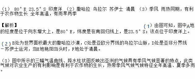 £¨1£© 80¡ãE 23.5¡ãS Ó¡¶ÈÑó £¨2£©Èö¹þÀ ÎÚÀ¶û ËÕÒÁÊ¿ Ç峿 £¨3£©¼¾·ç ÓêÈÈͬÆÚ£¬ÓÐÀûÓÚÅ©×÷ÎïÉú³¤ È«Äê¸ßΣ¬ÓÐÓ꺵Á½¼¾ ¡¾½âÎö¡¿£¨1£©ÓÉͼ¿ÉÖª£¬Í¼ÖÐAµØµÄ¾¶ÈÊÇλÓÚÏò¶«Ôö´óÉÏ£¬ÊÇ80¡ãE£¬Î³¶ÈÊÇÔÚÄϻعéÏßÉÏ£¬ÊÇ23.5¡ãS£»¸ÃµãλÓÚÓ¡¶ÈÑóÉÏ¡£ £¨2£©B´¦ÎªÊÀ½çÃæ»ý×î´óµÄÈö¹þÀɳĮ£¬C´¦ÊÇÑÇÅ··Ö½çÏßµÄÎÚÀ¶ûɽÂö£¬D´¦ÊÇÑÇ·Ç·Ö½çÏߣËÕÒÁÊ¿Ô˺ӣ¬µ±EµØÑÞÑôµ±Í·Ê±£¬FµØ´¦ÓÚÇå...