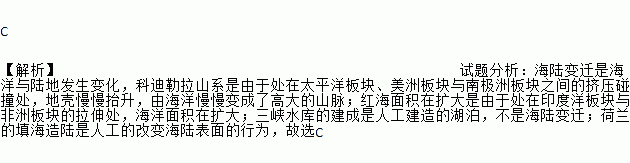 C ¡¾½âÎö¡¿ÊÔÌâ·ÖÎö£ºº£Â½±äǨÊǺ£ÑóÓ뽵ط¢Éú±ä»¯£¬¿ÆµÏÀÕÀ­É½ÏµÊÇÓÉÓÚ´¦ÔÚ̫ƽÑó°å¿é¡¢ÃÀÖÞ°å¿éÓëÄϼ«ÖÞ°å¿éÖ®¼äµÄ¼·Ñ¹Åöײ´¦£¬µØ¿ÇÂýÂý̧Éý£¬Óɺ£ÑóÂýÂý±ä³ÉÁ˸ߴóµÄɽÂö£»ºìº£Ãæ»ýÔÚÀ©´óÊÇÓÉÓÚ´¦ÔÚÓ¡¶ÈÑó°å¿éÓë·ÇÖÞ°å¿éµÄÀ­Éì´¦£¬º£ÑóÃæ»ýÔÚÀ©´ó£»ÈýϿˮ¿âµÄ½¨³ÉÊÇÈ˹¤½¨ÔìµÄºþ²´£¬²»ÊǺ£Â½±äǨ£»ºÉÀ¼µÄÌÔì½ÊÇÈ˹¤µÄ¸Ä±äº£Â½±íÃæµÄÐÐΪ£¬¹ÊÑ¡C