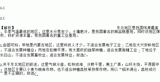1.C 2.C ¡¾½âÎö¡¿¶«±±µØÇøÊÇÎÒ¹úγ¶È×î¸ß¡¢¶¬¼¾ÆøÎÂ×îµÍµÄµØÇø£¬ÕâÀïË®·ÖÕô·¢ÉÙ£¬ÍÁÈÀ·ÊÎÖ£¬ÊÇÎÒ¹úÖøÃûµÄÉÌÆ·Á¸»ùµØ£¬Í¬Ê±¸ÃµØÇøÃºÌ¿¡¢Ìú¿ó×ÊÔ´·á¸»£¬ÓÐÎÒ¹úÖøÃûµÄÖØ¹¤Òµ»ùµØ¡£ 1.ÓÉͼ¿ÉÖª£¬¼×µØÊÇÄÚÃɹŵØÇø£¬ÕâÀï¿Æ¼¼È˲ÅÉÙ£¬²»ÊʺϷ¢Õ¹µç×Ó¹¤Òµ£»ÒÒµØÔÚ´óÐ˰²ÁëµØÇø£¬²»ÊʺϷ¢Õ¹ÖÖÖ²Òµ£»±ûµØÔÚËÉÄÛÆ½Ô£¬ÓдóÃæ»ýµÄÌð²ËÖÖÖ²£¬ÊʺϷ¢Õ¹ÖÆÌǹ¤Òµ£»¶¡µØÎ»ÓÚ³¤°×ɽ£¬²»ÊʺϷ¢Õ¹ÐóÄÁÒµ£¬ÊʺϷ¢Õ¹ÁÖÒµ£¬...