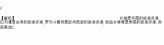C 【解析】长城是中国的旅游资源; 日月潭是台湾的旅游资源; 罗马斗兽场是欧洲西部的旅游资源; 自由女神像是美国的旅游资源;故答案选C.
