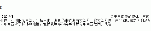 D ¡¾½âÎö¡¿¹ØÓÚ¶«ÄÏÑǵÄÐðÊö£¬¶«ÄÏÑÇλÓÚÑÇÖ޵Ķ«Äϲ¿£¬°üÀ¨ÖÐÄϰ뵺ºÍÂíÀ´ÈºµºÁ½´ó²¿·Ö£¬¾ø´ó²¿·ÖλÓÚÄϱ±»Ø¹éÏßÖ®¼äµÄÈÈ´ø£¬¶«ÄÏÑÇ´¦ÓÚµÍγ¶ÈµØÇø£¬°üÀ¨±±°ëÇòºÍÄϰëÇò¶¼Óж«ÄÏÑÇ·¶Î§£¬¹ÊÑ¡D¡£