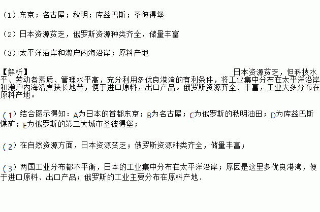 £¨1£©¶«¾©£»Ãû¹ÅÎÝ£»ÇïÃ÷£»¿â×ȰÍ˹£»Ê¥±ËµÃ±¤ £¨2£©ÈÕ±¾×ÊԴƶ·¦£¬¶íÂÞ˹×ÊÔ´ÖÖÀàÆëÈ«£¬´¢Á¿·á¸» £¨3£©Ì«Æ½ÑóÑØ°¶ºÍäþ»§ÄÚº£Ñذ¶£»ÔÁϲúµØ ¡¾½âÎö¡¿ÈÕ±¾×ÊԴƶ·¦£¬µ«¿Æ¼¼Ë®Æ½¡¢ÀͶ¯ÕßËØÖÊ¡¢¹ÜÀíˮƽ¸ß£¬³ä·ÖÀûÓöàÓÅÁ¼¸ÛÍåµÄÓÐÀûÌõ¼þ£¬½«¹¤Òµ¼¯Öзֲ¼ÔÚ̫ƽÑóÑØ°¶ºÍäþ»§ÄÚº£Ñذ¶ÏÁ³¤µØ´ø£¬±ãÓÚ½ø¿ÚÔÁÏ£¬³ö¿Ú²úÆ·¡£¶íÂÞ˹×ÊÔ´ÆëÈ«¡¢·á¸»£¬¹¤Òµ´ó¶à·Ö²¼ÔÚÔÁϲúµØ¡£ £¨1£©½áºÏͼʾµÃÖª£ºAΪÈÕ±¾...