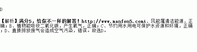 A.利用风力发电 B.增加绿化面积 C.节约用水用电 D.直接排放废气