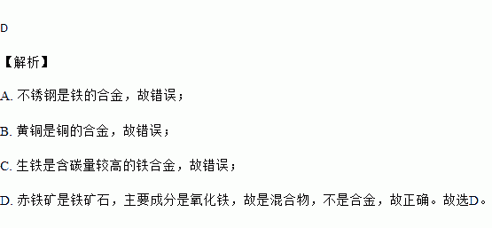 A.不锈钢 B.黄铜 C.生铁 D.赤铁矿