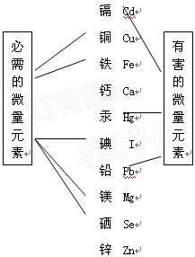 人们每天通过摄取食物不断补充所需要的各种元素,但有时也会摄入某些有害的元素。请指出下列矿物元素中,哪些是人体必需的微量元素,哪此进对人体有害的微量元素。(试用线连接)