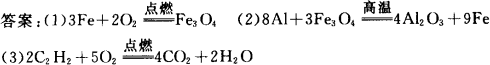 分析:此题考查的是化学方程式的配平. (1)式可用观察法配平.在Fe3O4中有3个Fe原子,4个O原子,故应在Fe前填写化学计量数3,在O2前填写化学计量数2,化学方程式为3Fe+2O2 (2)式可用最小公倍数法配平.式子两边氧原子数较多,左边为4,右边为3,最小公倍数为12,因此,Fe3O4前的化学计量数为12÷4=3,Al2O3前的化学计量数为12÷3=4.再用观察法,可确定Al前的化学计量数为8,Fe前的化学计量数为9,化学方程式为8Al+3Fe3O4 (3)式可用奇数配偶法配平.观察此式,左边氧原子数为偶数2,右边氧原子数为奇数3,其中CO2中O原子数为偶数,H2O中O原子数为奇数,可在H2O前试写最小偶数2,将奇数变成偶数.接着,以2H2O为标准,根据H原子数为4,应在C2H2前填写化学计量数2.再以2C2H2为标准,根据C原子数为4,应在CO2前填写化学计量数4,最后根据生成物中O原子总数为10个,应在O2前填写化学计量数5,化学方程式为2C2H2+5O2 |