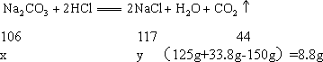 将氯化钠和碳酸钠的混合物33.8g放入125g稀盐酸中,恰好完全反应,得氯化钠溶液150g.计算: