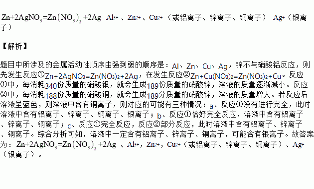 将一定量的Zn加入含有Cu(NO3)2、AgNO3和Al(NO3)3的混合溶液中,充分反应后过滤,可以得到固体和溶液。其中会导致溶液质量减小的化学反应方程式为_________;若反应后溶液呈蓝色,此时溶液中一定含有的金属离子有_________,可能含有的金属离子有_________。