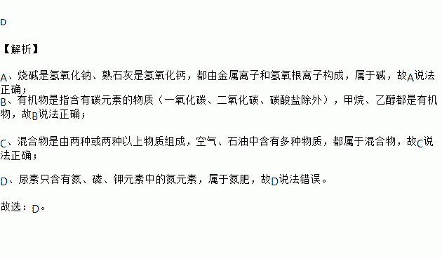 C.混合物:空气、石油 D.复合肥料:尿素、硝酸钾