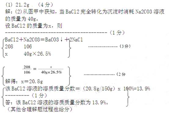 £¨6·Ö£©ÊµÑéÊÒÓÐһƿδ֪Ũ¶ÈµÄBaCl2ÈÜÒº£¬Ä³Í¬Ñ§È¡³ö150g¸ÃÈÜÒºÓÚÉÕ±ÖУ¬ÏòÆäÖÐÖðµÎ¼ÓÈëÈÜÖÊÖÊÁ¿·ÖÊýΪ26.5%µÄNa2CO3ÈÜÒº¡£·´Ó¦¹ý³ÌÖÐÉú³É³ÁµíµÄÖÊÁ¿ÓëËùÓÃNa2CO3ÈÜÒºÖÊÁ¿µÄ¹ØÏµÈçͼ¼×Ëùʾ¡£ÒÑÖª£ºBaCl2£«Na2CO3£½BaCO3¡ý£«2NaCl Çë¼ÆË㣺